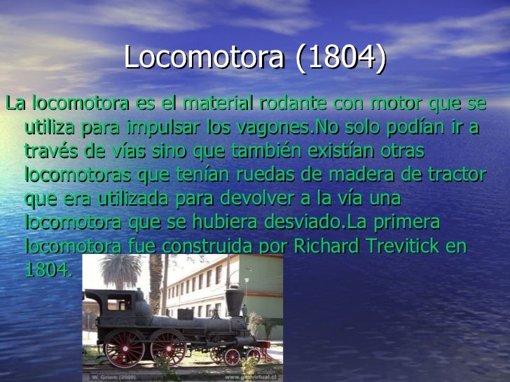 - . Locomotora (1804)La locomotora es el material rodante con motor que se utiliza para impulsar los vagones.No solo podían ir a través de vías sino que también existían otras locomotoras que tenían ruedas de madera de tractor que era utilizada para devolver a la vía una locomotora que se hubiera desviado.La primera locomotora fue construida por Richard Trevitick en 1804.